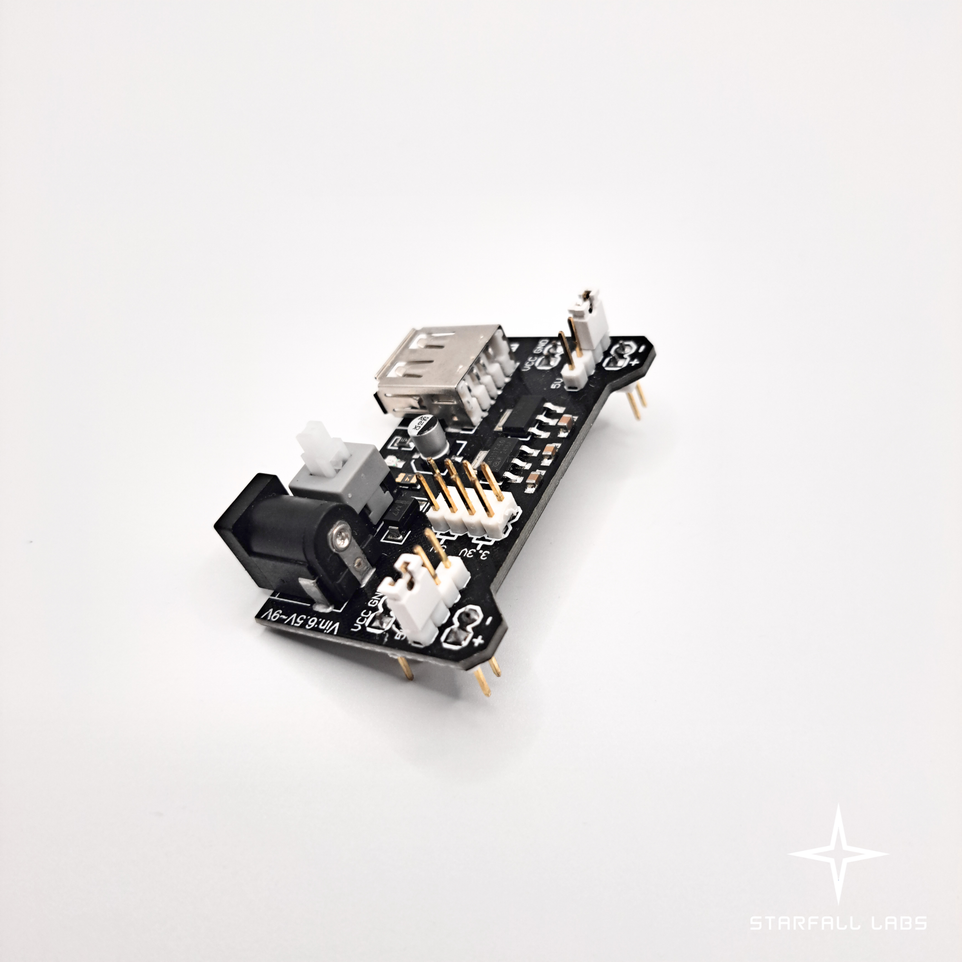 It plugs straight into the power rails of a standard MB102 breadboard and uses onboard voltage regulators to convert your input (typically from a DC barrel jack or USB source) into stable 3.3V or 5V outputs. Each rail can be set independently, giving you flexibility when powering different components at once.